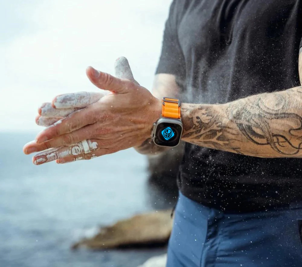 La POUY Watch ULTRA est taillée pour offrir des performances inégalées. Son boîtier en titane, à la fois léger, robuste et anti‑corrosion, présente des bords surélevés pour protéger l’écran en verre saphir des impacts latéraux.
